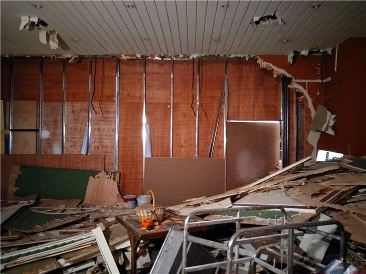 施工進度:繼續(xù)進行現(xiàn)場的地臺瓷磚拆除,頂部實木吊頂,石膏板拆除,及時清運現(xiàn)場的裝修垃圾和建渣。