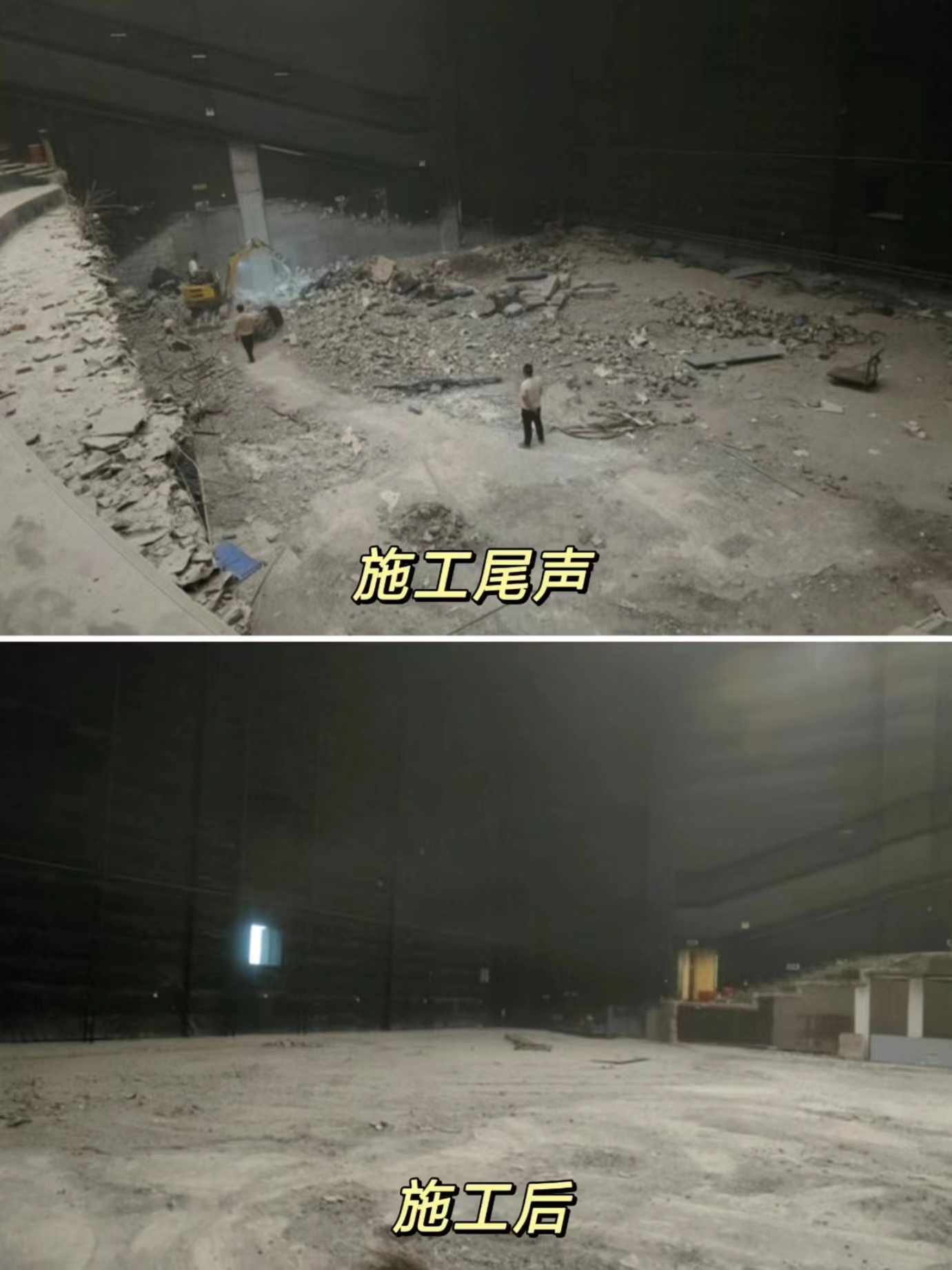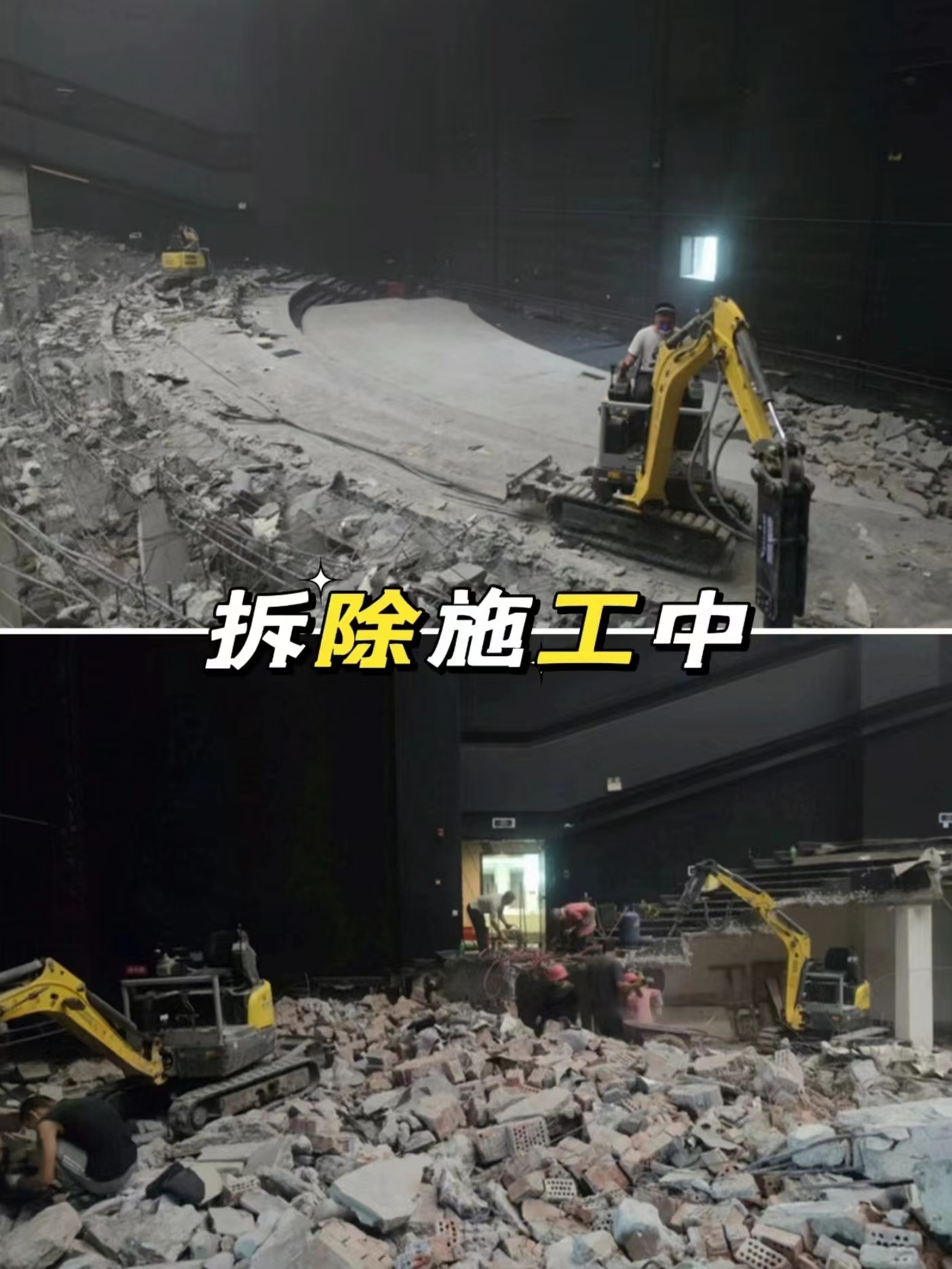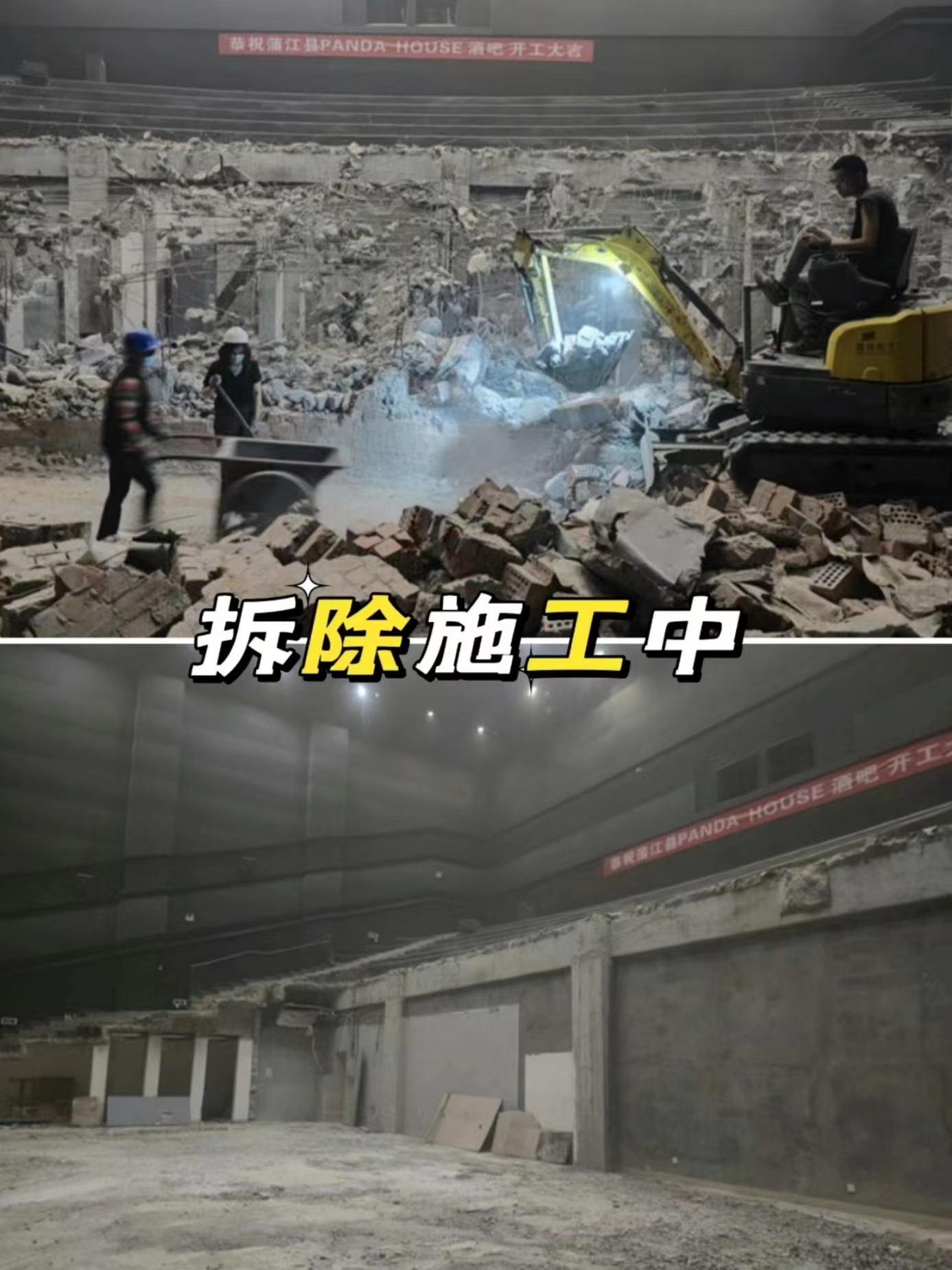 這個(gè)案例是商家通過線上找到我們,是蒲江原本一個(gè)巨幕廳,現(xiàn)準(zhǔn)備全部拆除,裝修成酒吧,所以需要對階梯等室內(nèi)設(shè)施進(jìn)行拆除。