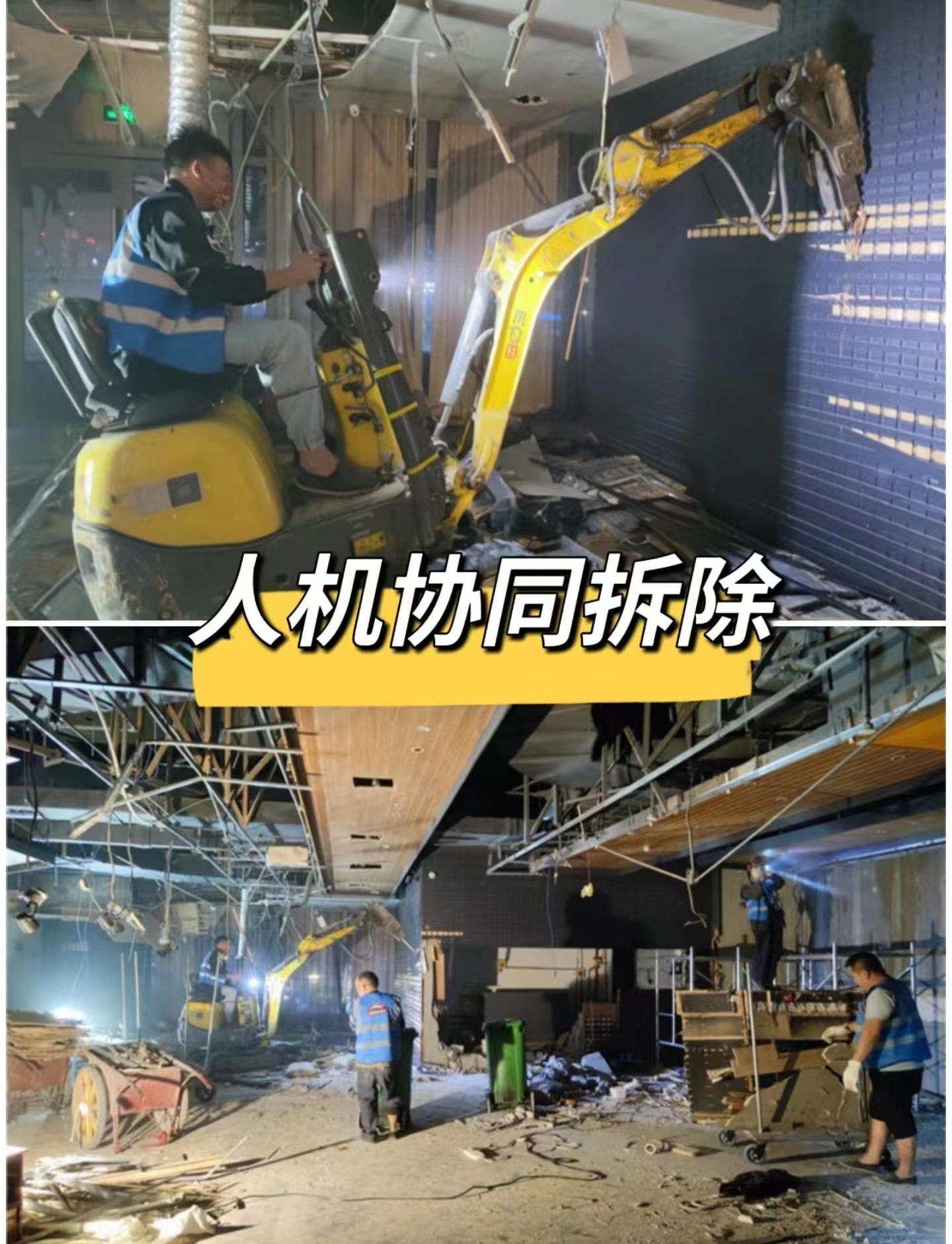 這這個(gè)個(gè)拆除工地總共時(shí)間為7天,拆除面積大,工期要求盡可能縮短,安排了小型挖掘機(jī)對(duì)室內(nèi)難拆除施工的地方進(jìn)行人機(jī)協(xié)同拆除。